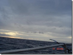 The storm clouds are directly overhead. However, far off to the port side I can see the clouds clearing up. A fantastic sunset. Better weather tomorrow? Dinner is 2 power bars and a milkshake accompanied by catching up with updates from Dee Caffari and Aviva Challenge. Dee is attempting to sail around the world against the prevailing winds.
