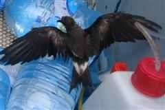 Had a surprise visitor this morning. Found a small black bird taking shelter by the bilge pump by the boat. Guess it had lost its way during the night and was attracted by the nav lights on the boat. Not sure what type it is. Its small and black with webbed feet, does not eat oreo cookies, protein bars, pringles or peanut butter, and has a white stripe on its head. Any guesses?