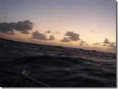 Pitch dark with no moonlight, but a brilliant star show out. Much harder to watch the horizon as it is hard to say where the water ends and sky begins and the stars get mistaken for ships light. The boat rising and falling about 3-4 meters (9-10 feet) with the large waves caused by a storm to the North. Only a few seconds at the top of the crest before plunging down again between 2 black walls of water on either side.