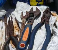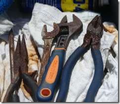 Rusty tools – Dealing with rust. One of the many irritations on board. Tools have gone rusty as I've been using them in the water. The pliers do not work any more. Incidentally, the spray can of WD40 which is supposed to prevent rust, has also rusted. Go figure that one out.