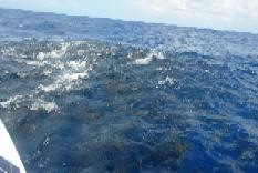 The first sign of something unusual happening was when I noticed a smooth patch of water just just a bit north of the stern. A few minutes later, I could make out a big silver mass under the water making its way towards me, which dissolved into a school of hundreds of Doradas swimming at top speed toward the boat. A telltale sign they are being chased. I grabbed the video camera just in time to film a massive tail fin cutting an arc thru the water, heading for the fish below the boat. A few seconds later the water underneath the boat erupted into a complete war zone with fish jumping out of the water and the shark circling around, diving and re-surfacing before its next attack.