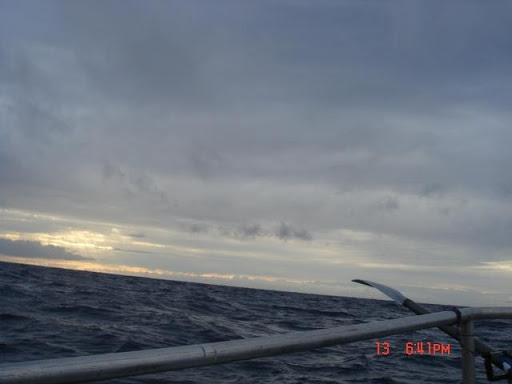 The storm clouds are directly overhead. However, far off to the port side I can see the clouds clearing up. A fantastic sunset. Better weather tomorrow? Dinner is 2 power bars and a milkshake accompanied by catching up with updates from Dee Caffari and Aviva Challenge. Dee is attempting to sail around the world against the prevailing winds.