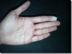 1. The State of my hand, after rowing an 20,000 meters in the gym. Fortunately, present loss of feeling in my hands is keeping the pain away.