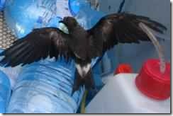 Had a surprise visitor this morning. Found a small black bird taking shelter by the bilge pump by the boat. Guess it had lost its way during the night and was attracted by the nav lights on the boat. Not sure what type it is. Its small and black with webbed feet, does not eat oreo cookies, protein bars, pringles or peanut butter, and has a white stripe on its head. Any guesses?
