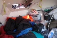Cabin. Surival Suit (0range) as pillow, Sleeping mat, (Black) Maps, Charts, Electronics. Water leak in compartments below sleeping area.