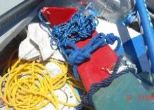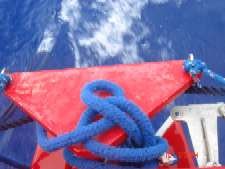 “The rudder is too big to be pushed thru the rear hatch of the cabin. So it has to be fitted from outside the boat. Put the rudder out from the side and tie two lines, one primary and one secondary. It lets the rudder drag thru the water without floating away. Throw one end of the primary line towards the rear hatch. Open the hatch, lean out and drag the rudder to the back of the boat. Tie the primary to the stern. Close all hatches. Get into the water. Make sure that the plastic padding is on the hinges. Lift the rudder up and try to mount it on the pins. No good. Get back in the boat. Open the rear hatch again. Lean out. Pull the rudder up. Wait for the large waves to pass. Place the rudder on the pin. Push it down. Grab the tiller lines from either side. The unsecured rudder is banging around the back. Quickly, pull the lines thru the side rings and on to the cleats at the front. Lock the tiller lines down. Relax”